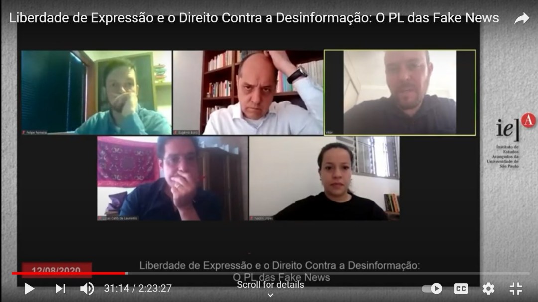 É possível o Direito combater a desinformação na internet sem violar a liberdade de expressão, a liberdade de informação e a privacidade? Como exigir a transparência de empresas de tecnologia como as mídias sociais, em nome das liberdades individuais e do combate a fraudes informativas e ao discurso de ódio, sem que isso implique em violação do segredo comercial das empresas? Como a Lei deve enquadrar quem promove ou financia campanhas de desinformação ou difamação em massa por meio de robôs ou perfis falsos? Quais condutas são esperadas, e que normas jurídicas devem disciplinar o uso dos perfis de órgãos públicos e políticos em mídias sociais? Como construir jurídica e politicamente um marco legislativo que possa fortalecer as liberdades individuais e públicas e própria esfera pública em detrimento da desinformação e dos discursos de ódio na internet? Quais papéis devem desempenhar outros atores da sociedade no enfrentamento dos problemas da desinformação? O grupo de pesquisa Jornalismo, Direito e Liberdade da ECA-USP e do IEA-USP, convida os juristas e pesquisadores da PUC-Campinas Lucas Catib de Laurentiis e Felipe Grizotto para debater esses que são alguns dos desafios em torno do Projeto da Lei Brasileira de Liberdade, Responsabilidade e Transparência na Internet (PL 2360/20), aprovado no Senado no último dia 30 de junho e atualmente em discussão na Câmara dos Deputados. (Vitor Blotta)