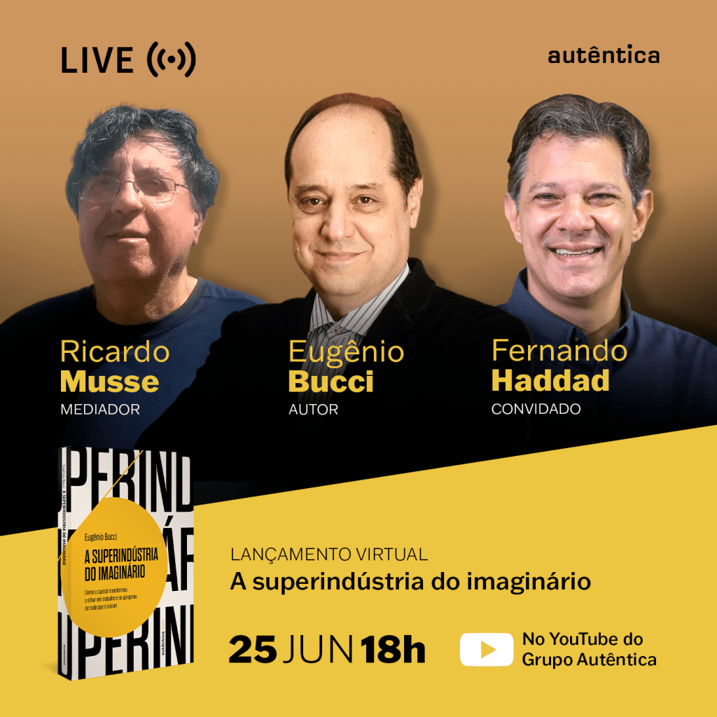 Nesta sexta, 25 de junho, a Autêntica Editora promove o lançamento virtual de A superindústria do imaginário – Como o capital transformou o olhar em trabalho e se apropriou de tudo que é visível, de Eugênio Bucci. A live contará com a participação do autor e do professor Fernando Haddad, com mediação de Ricardo Musse, também professor na USP e coordenador da coleção Ensaios, pela qual o livro será publicado. A conversa tem início às 18h e será transmitida tanto pelo canal do YouTube do JDL e no canal do YouTube do Grupo Autêntica.