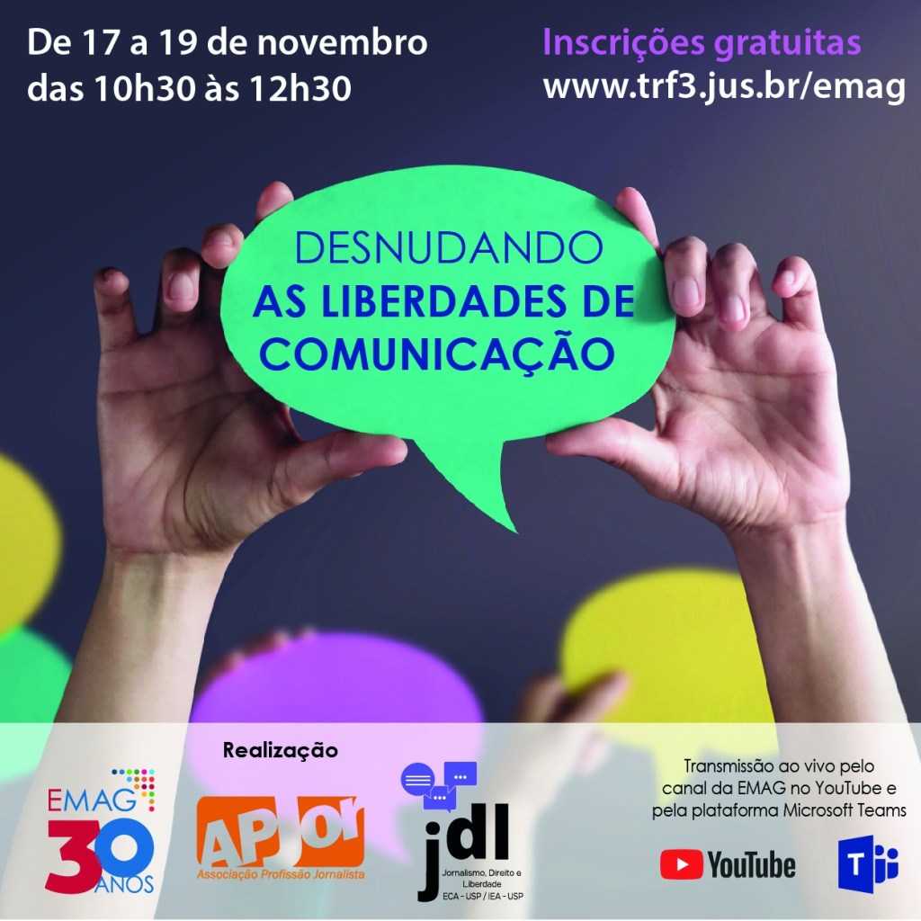 Link para inscrição via site da EMAG: https://www.trf3.jus.br/emag/cursosemag/cursos-2021/desnudando-as-liberdades-de-comunicacao